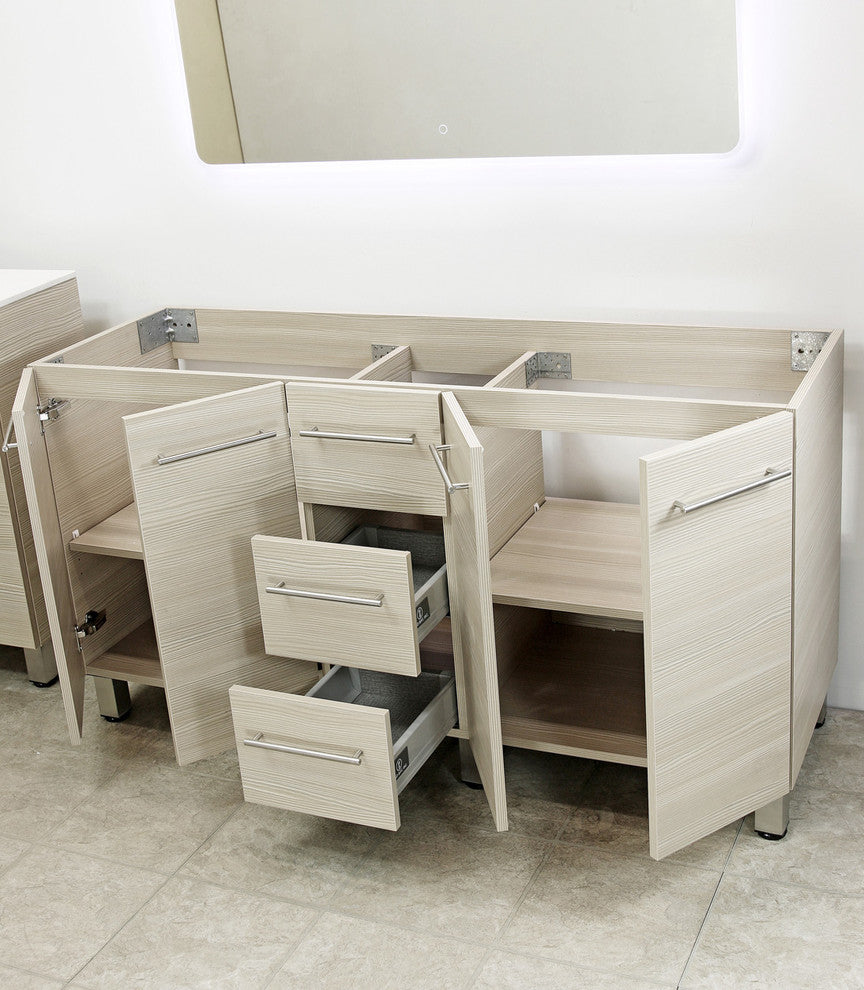 Vanity cabinet:•  Brand: WindBay •  Cabinet width : 59"•  Cabinet depth: 20"•  Cabinet height without countertop: 31-3/4"•  3 Heavy duty soft-closing drawer gliders. •  Durable finish and easy to maintain.•  Upgraded brackets. Construction hurricane grade brackets.•  Heavy Duty hydraulic soft-closing hinges.•  Cabinet fully assembled. Customer must install the legs and handles.•  Completely finished panels, including edges.•  Stainless steel adjustable legs.White quartz under mount countertop with built-up edges: All our counter tops are made from real quartz stone. Polished in a high durable stain and scratch resistant finish. Two faucet holes are prefabricated. •  Width: 59-1/4" •  Depth: 20-1/4" •  Height: 3-1/8" •  Faucet hole: 1-3/8"(35mm) diameterWhite ceramic undermount sink with overflow: •  Width: 18" •  Depth: 11" •  Height: 5-1/2" •  Drain hole: 1-3/4"(45mm) diameter •  Round overflow with chrome trimIncludes: Sink, countertop, vanity cabinet, handles, and legs. The faucet is not included.Attention:Due to screen differences, the actual color may vary slightly from what appears on your monitor or phone. Contact us for a color sample if you need help selecting a finish.