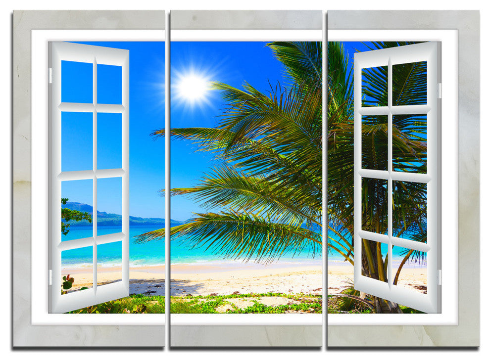 "Window Open to Beach With Palm" Metal Wall Art, 3 Panels, 36"x28"