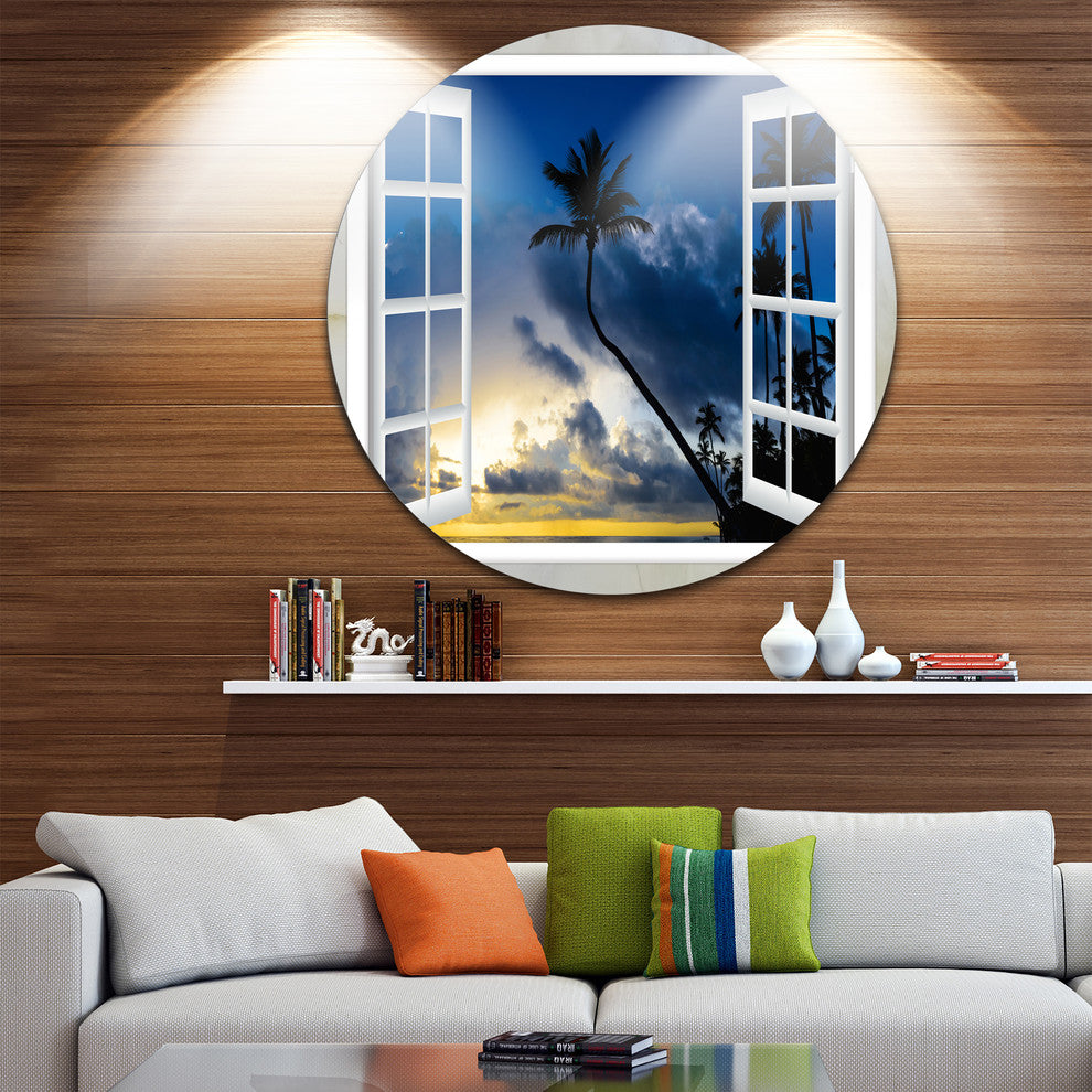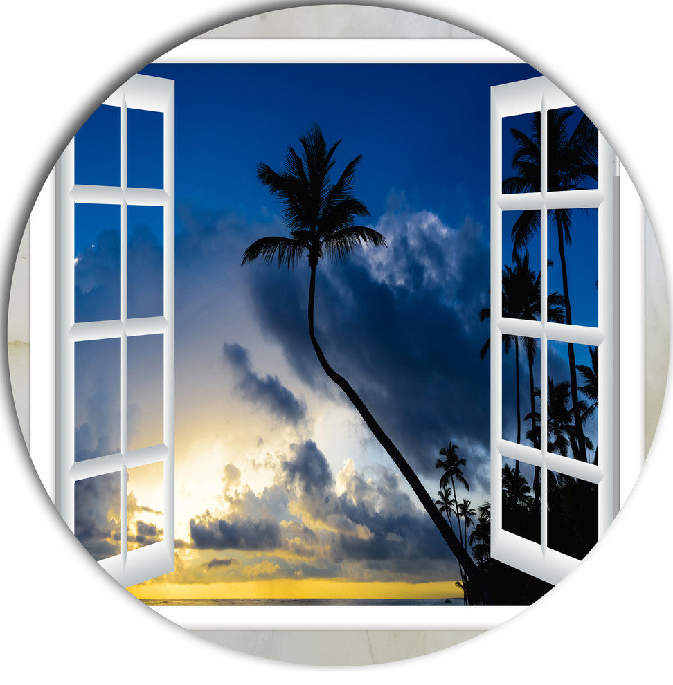 Window To Beach With Coconut Palms, Landscape Disc Metal Wall Art, 23"