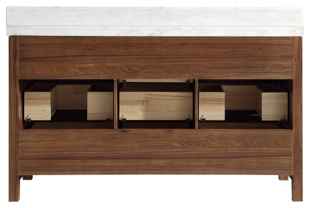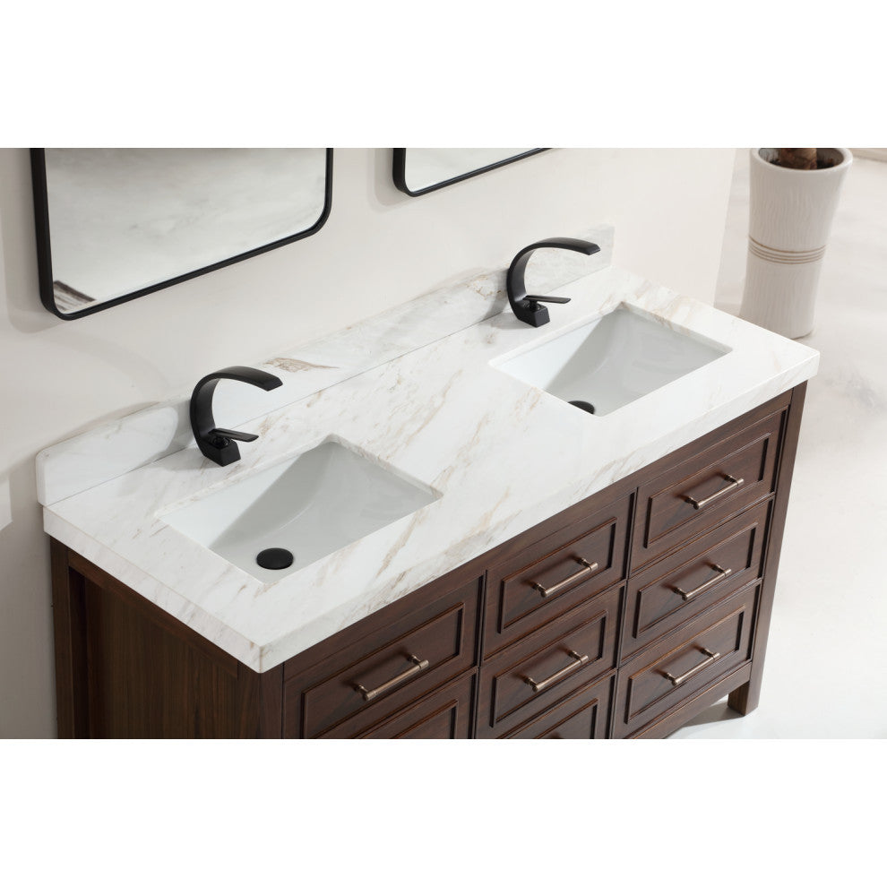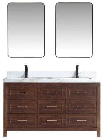 Dimensions: L:60 x W:22 x H:35.4Finish: Ebony Dark Brown2" Natural Marble top, Ceramic sinkIncluded Faucet, Mirror and Wall LightingFaucet hole : 1 Pre-drilled holesWood Material: Ebony Wood1-year parts-only warranty on manufacturer defects