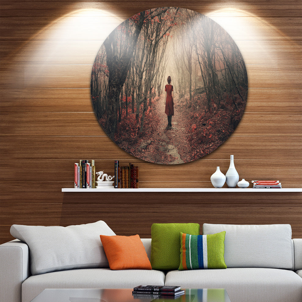 Bring Contemporary Abstraction to your home with this large Circle Metal wall art. This Woman in Frosty Forest Metal Artwork makes it the focal point of any room or office.