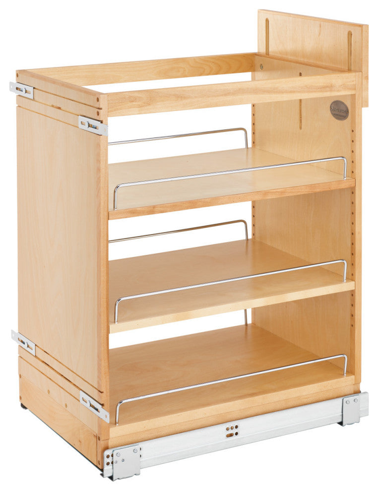 If you''re tired of cluttered, unorganized and hard to access cabinets, then look no further than Rev-A-Shelf''s pullout shelving system. This innovative series of pull-out organizers are available in a variety of sizes (depth, height and width) and are available in a variety of style to accommodate any type of kitchen. From baking sheets, spices, cutting boards, utensils and even knife organization. No kitchen is complete without one of these organizers and it will change how you use your kitchen. All units require a full-height cabinet (where no drawer is above) and cabinet door must attach to gain the full features of the unit.-Included: (1) Wood organizer, adjustable shelves with Chrome rails and mounting hardware-Slide Type: 110lb Full-Extension BLUMOTION Slides w/Soft-Close-Fully assembled and fits into an existing full height cabinet-Adjustable and/or removeable shelves-Adjustable rub bushings for a precise fit-Once installed simply attach your own cabinet door-Designed for a full-height 18" cabinet with a 14-1/2" W or larger opening-Door mount brackets: Adjustable door mount brackets are Included: and required for operation-Construction: Fully Assembled Maple Wood construction with a clear coat finish for durability-Mounts to cabinet floor and attach existing cabinet door