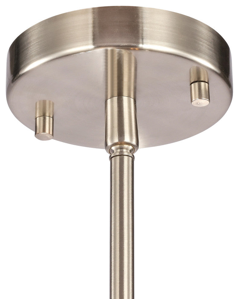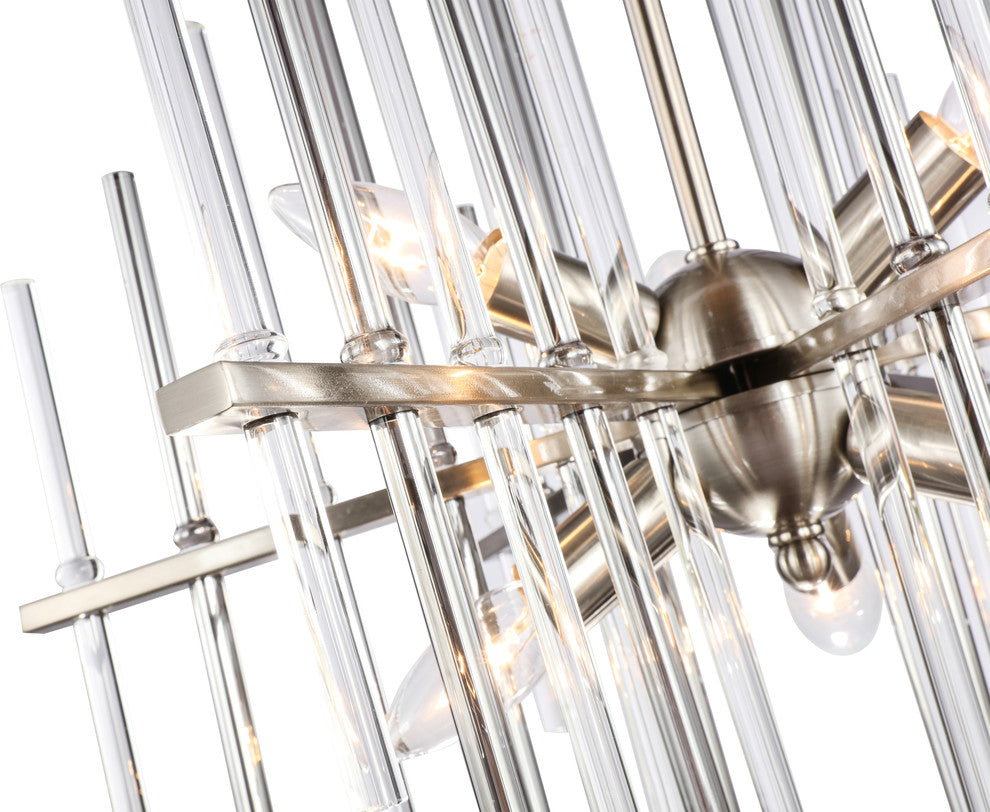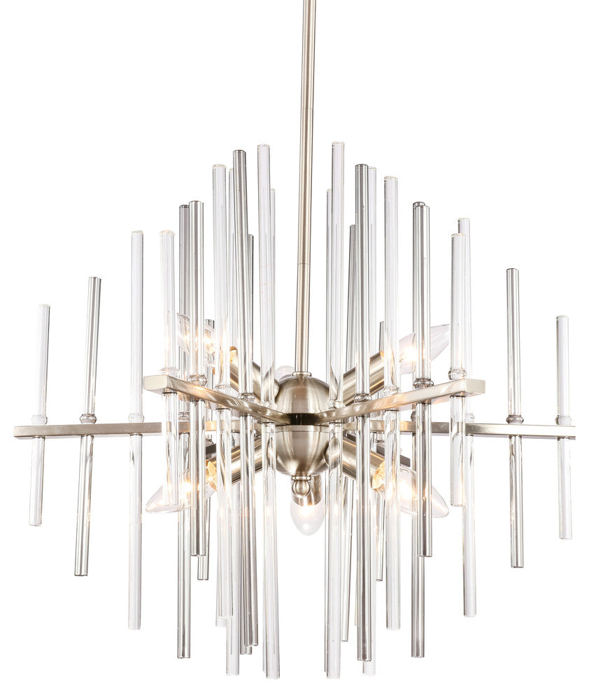 The Spires collection takes parallel rods of glass that increase in height towards a peak at the center. These vertical rods are in alternating clear and plated glass for an enhanced effect as the lights radiate and reflect the individual glass sticks to create a luxurious ornament.This six-light sputnik chandelier consists of 6 branches filled with glass rods for a unique and wealthy look. Choose from brass or satin nickel finishes. The brass finish comes with matching amber and clear class, whereas the satin nickel finish comes with matching plated chrome and clear glass.Fixture dimensions : 20"D x 45"HClear and plated chrome glass rodsIncludes stems 1 x 4" + 1 x 6" + 2 x 12", additional stems available for purchaseHinged joint for sloped installation