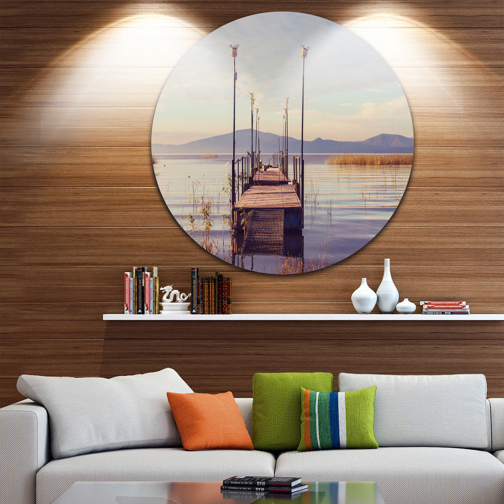 Bring Contemporary Abstraction to your home with this large Circle Metal wall art. This Wooden Boardwalk to Clear Sea Water Metal Artwork makes it the focal point of any room or office.
