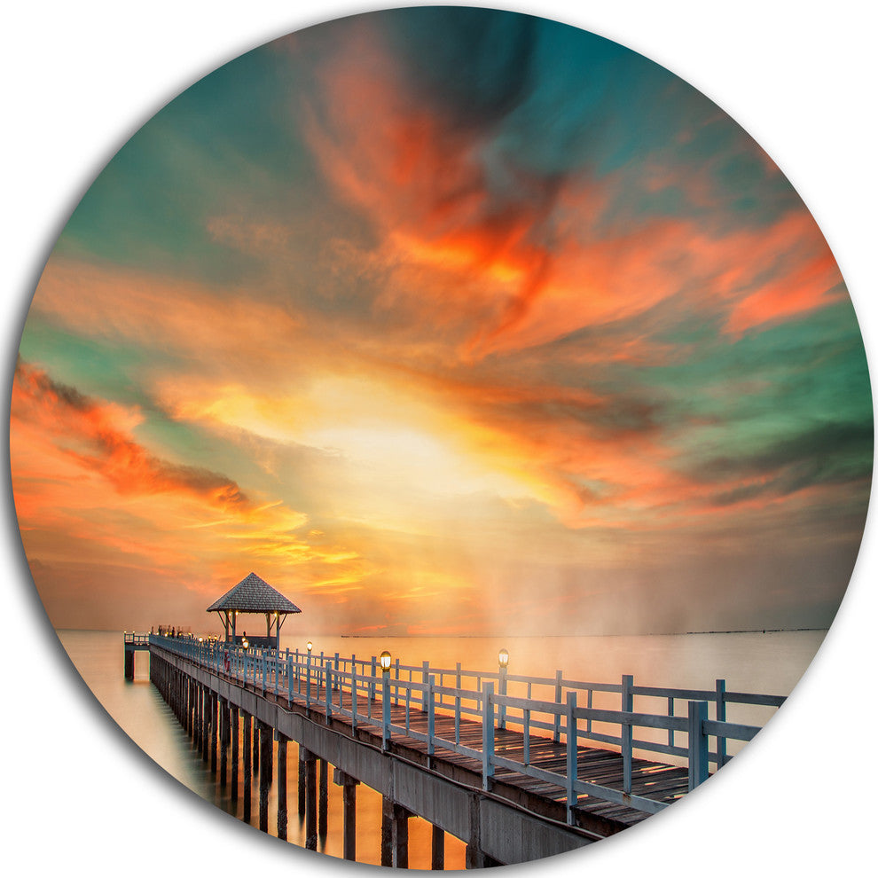 Wooden Bridge Under Colorful Sky, Sea Bridge Disc Metal Wall Art, 11"