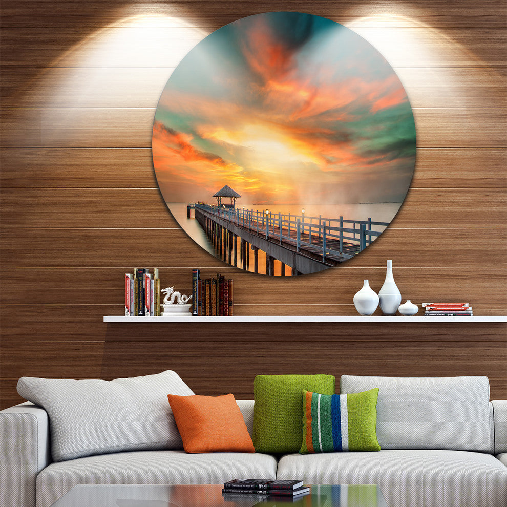 Bring Contemporary Abstraction to your home with this large Circle Metal wall art. This Wooden Bridge under Colorful Sky Metal Artwork makes it the focal point of any room or office.