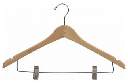 These sturdy, well-constructed hardwood hangers feature a space-saving body, two carefully crafted notches for the option of hanging straps, and a polished chrome swivel hook. This style also features two polished chrome clips with anti-stain clear cushions. The curved form of these hangers mimics the shape of the body and helps to preserve the integrity of your garments. Finished with a double coating of lacquer to prevent splintering, these high quality, low cost hangers will last you for a lifetime.