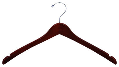 These sturdy, well-constructed hardwood hangers feature a space-saving body, two carefully crafted notches for the option of hanging straps, and a polished chrome swivel hook. The curved form of these hangers mimics the shape of the body and helps to preserve the integrity of your garments. Finished with a double coating of lacquer to prevent splintering, these high quality, low cost hangers will last you for a lifetime.
