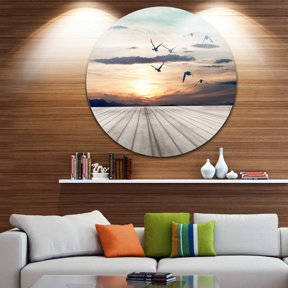 Bring Contemporary Abstraction to your home with this large Circle Metal wall art. This Wooden Floor Sunset Metal Artwork makes it the focal point of any room or office.