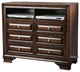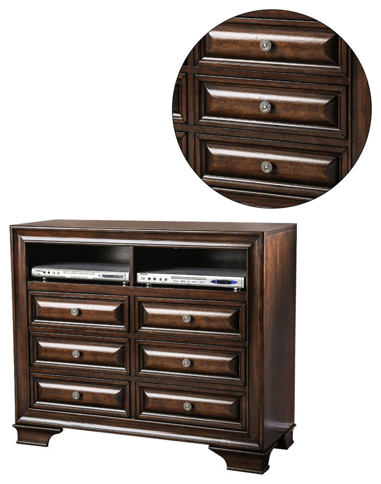 This media chest offers an English dovetail style. It is visually stunning and has generous storage space to keep your fabulous new room clutter-free. With six drawers and two open shelves, this media chest can fit all your media needs, DVD collections, and more. The deep chestnut finish and antique hardware of this piece give it a subtle elegance.