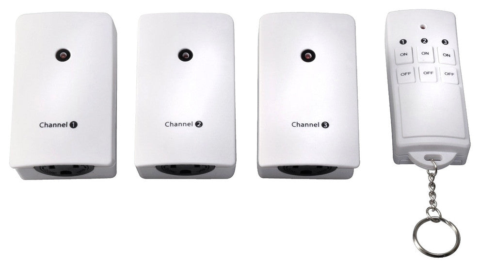 The Woods® 13569 Plug-In Indoor Wireless Remote Control with 3-Outlets operates up to 3 different home appliances from across the room, or another area of your house, using one remote control. Use the remote outlets in one room or multiple locations up to 66 feet away; beneficial for the mobility-impaired and anyone who just wants a one-touch, convenient way to turn lighting or appliances on and off. This package includes (3) receivers each with a space-saving grounded outlet, (1) transmitter and 12 volt battery. CFL compatible and LED ready, and is cUL certified for quality assurance. The Woods® Indoor Wireless Remote Control with 3-Outlets offers a fast, tool-free set-up and is easy to operate by the simple touch of a button. Use it to turn on lamps, activate holiday displays, operate electric fans and so much more. Perfect for hard to reach lamps and holiday decorations. The Woods® brand of timers and home controls bring simplicity to your life, by maximizing convenience, security and energy savings.