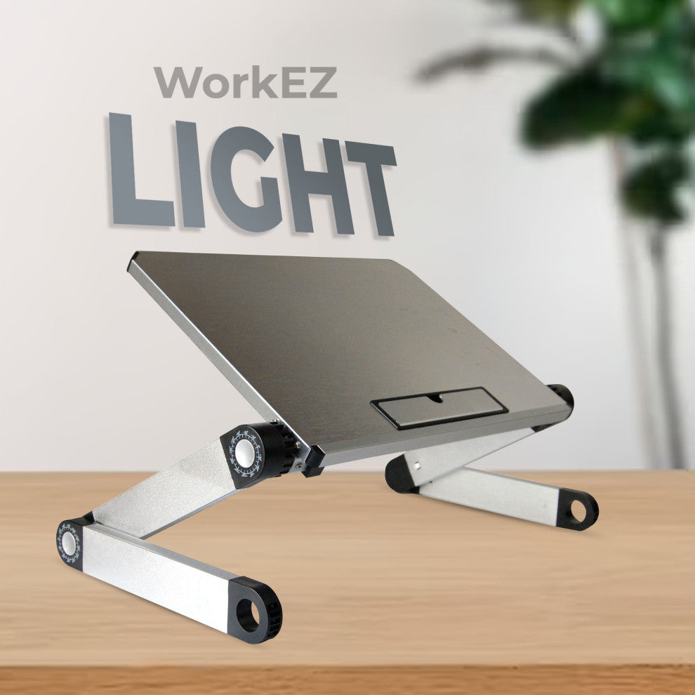 Simple, Lightweight, and Compact - WorkEZ Light makes computing and reading more comfortable just about everywhere. WorkEZ Light is the lightest (1.8lbs!), smallest and most portable WorkEZ Stand. It adjusts up to 12 in tall and the panel tilts from flat to vertical. Made of aluminum, it naturally dissipates heat to cool laptops. Incredibly versatile, WorkEZ Light isn''t limited to holding laptops. It''s sturdy enough to hold books, tablets and monitors.