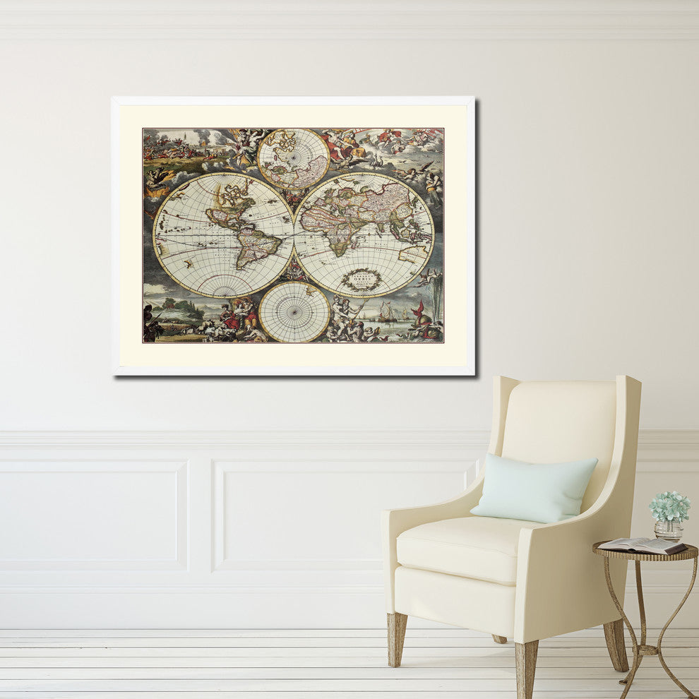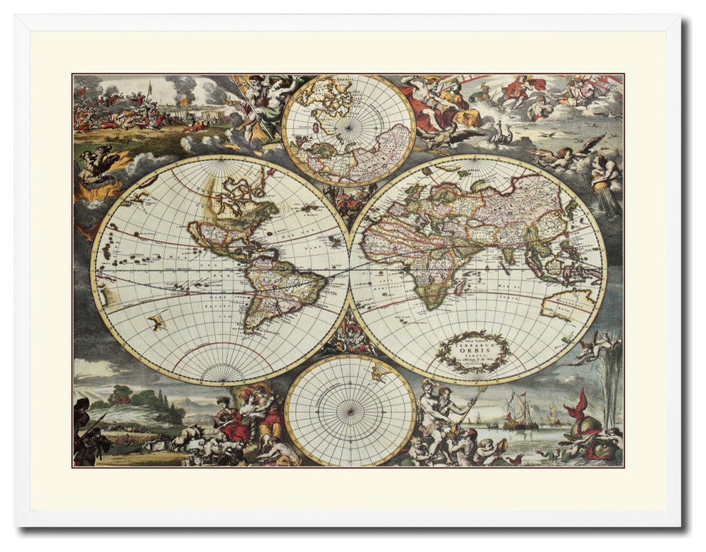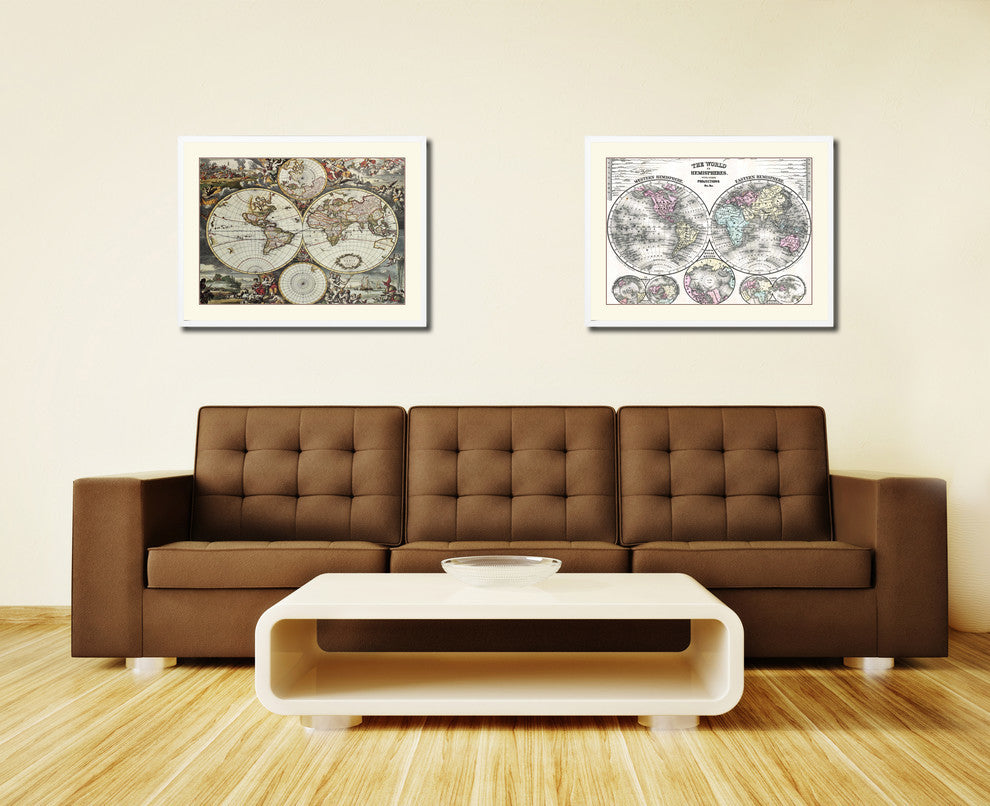 World Hemispheres Old Map Print On Canvas With Frame Art Collection 16" X 21", W