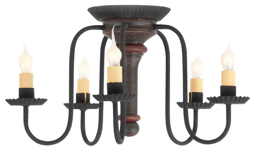 Wrought iron & distressed wood5 candle arm ceiling lightIn espresso brown and salem brick redThis stunning primitive country ceiling light will most certainly become a charmingly warm addition with its simple yet stylish elegance!Perfect for any room. The five arms allow for plenty of light with 60 watts max. Per arm. The center is spun from poplar hardwood then painted. It will provide plenty of light in entrances, hallways and bedrooms throughout your home.This will instantly add a splash of country charm to the plainest of spaces.Wired with five candelabra sockets, 60 watts max per socket.Designed to be direct wired into an electrical box in the ceiling.Ul listedBulbs are not includedMeasures: 10"h x 15 1/2"wMade in the usa