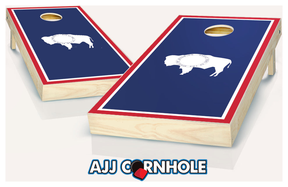This top of the line Wyoming Flag Cornhole Set is sure to bring life to any party! Set comes ready to play with 4 red and 4 royal blue cornhole bags. All sets are made using a premium 2x4 frame and 1/2" sanded plywood playing surface. Each set has folding 2x4 legs secured with galvanized bolts.