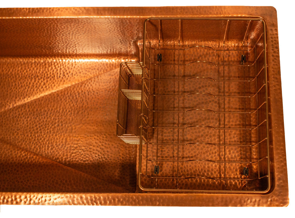 In collaboration with Studio Dearborn, Nantucket Sinks proudly presents The Steppe (TM) Sink. Sleek and practical, this two-tiered sink is designed with an eye on function and a nod to character. The rich warm hue of copper imbues the sink with organic authenticity to create a unique focal point to the kitchen. The Steppe"™s innovative design features a full depth basin plus a lowered platform and custom dish rack for rinsing and air drying. The 10 inch deep, 25"� wide large single bowl allows plenty of space to soak and clean large cookware and bakeware. Adjoining the spacious basin, a raised platform drain area helps to keep water in the sink and off your counters, with a slight pitch to drain freely into the basin drain.The included removable wire dish rack fits into the raised platform for drying.The basin has a side set drain to give more unobstructed surface area. This large sink includes coordinated finish dish drying rack. Fabricated with premium 16 Gauge high grade copper. Small radius corners make for easy cleaning. This sink can be installed with the drain on the left or right.Material: CopperGauge:16 Finish: Light Antique Copper Exterior Dimensions: 39" x 18" x 10.75" nominalInterior Sink Dimensions (excluding platform): 25" x 15.75" x 10" nominalDish drainer platform 12"� wide x 16". Slopes 5.5"� - 5.75" deepThis sink is crafted from premium16 Gauge CopperIncludes removable and portable copper drying basketBuilt in raised drain platform help keep water in the sink and off your countersFinish: Hand Hammered