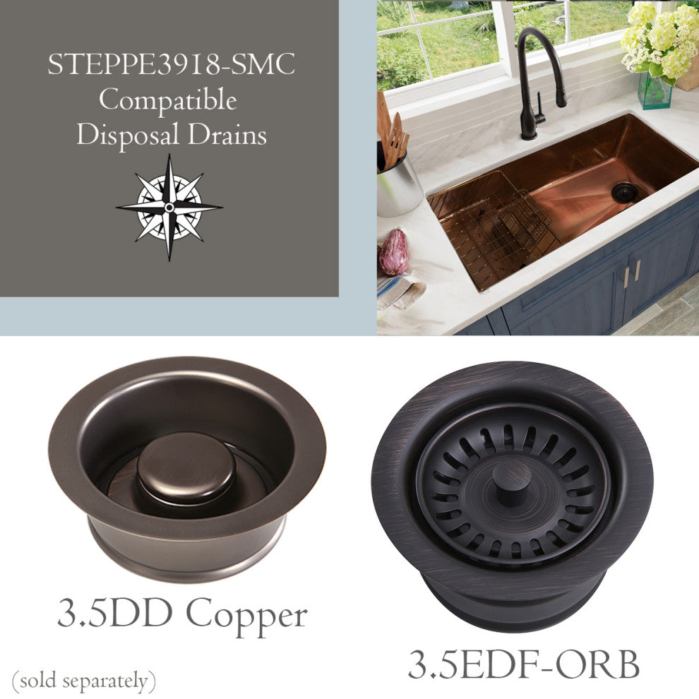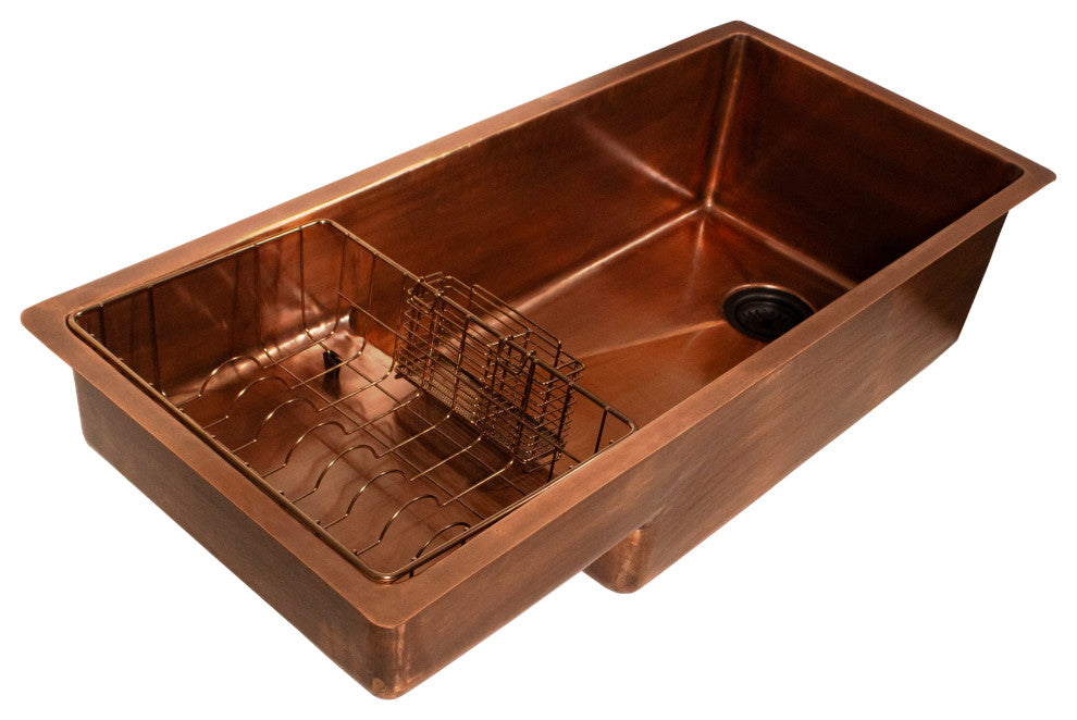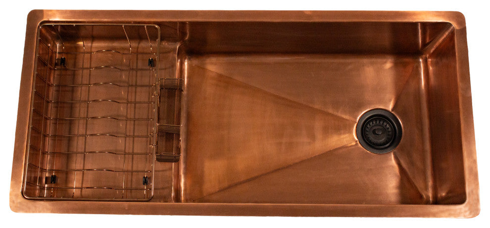 In collaboration with Studio Dearborn, Nantucket Sinks proudly presents The Steppe (TM) Sink. Sleek and practical, this two-tiered sink is designed with an eye on function and a nod to character. The rich warm hue of copper imbues the sink with organic authenticity to create a unique focal point to the kitchen. The Steppe"™s innovative design features a full depth basin plus a lowered platform and custom dish rack for rinsing and air drying. The 10 inch deep, 25"� wide large single bowl allows plenty of space to soak and clean large cookware and bakeware. Adjoining the spacious basin, a raised platform drain area helps to keep water in the sink and off your counters, with a slight pitch to drain freely into the basin drain.The included removable wire dish rack fits into the raised platform for drying.The basin has a side set drain to give more unobstructed surface area. This large sink includes coordinated finish dish drying rack. Surface Finish: Smooth CopperFabricated with premium 16 Gauge high grade copper. Small radius corners make for easy cleaning. This sink can be installed with the drain on the left or right.Material: CopperGauge:16 Finish: Light Antique Copper Exterior Dimensions: 39" x 18" x 10.75" nominalInterior Sink Dimensions (excluding platform): 25" x 15.75" x 10" nominalDish drainer platform 12"� wide x 16". Slopes 5.5"� - 5.75" deepThis sink is crafted from premium16 Gauge CopperIncludes removable and portable copper drying basketBuilt in raised drain platform help keep water in the sink and off your counters