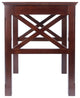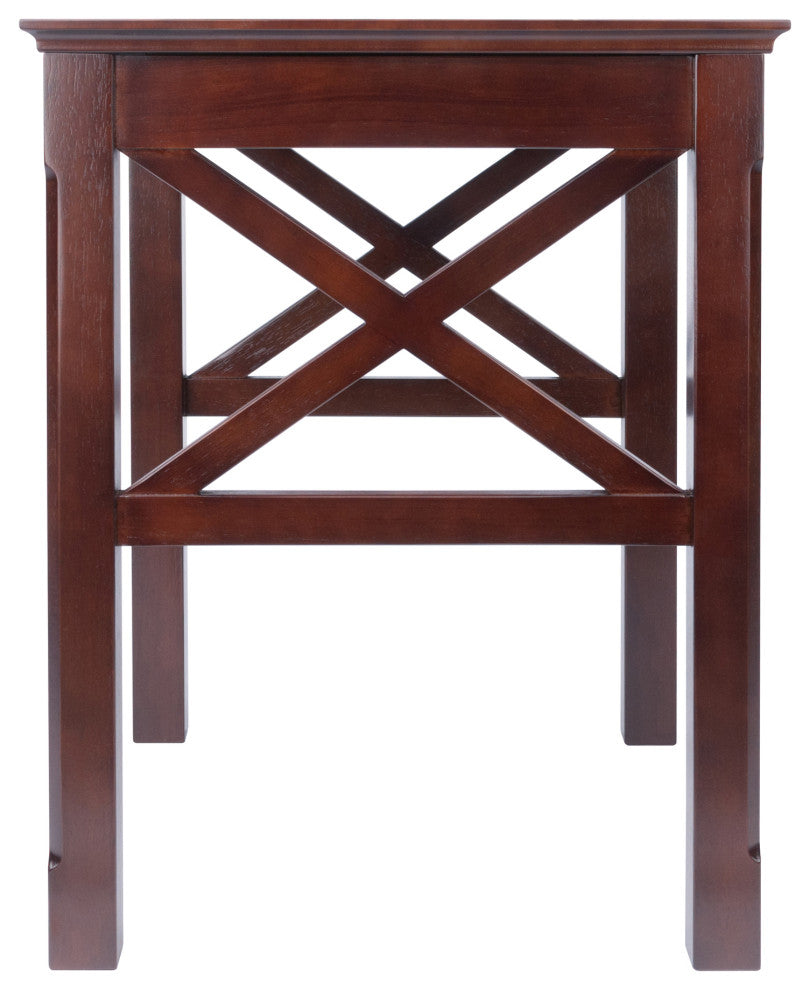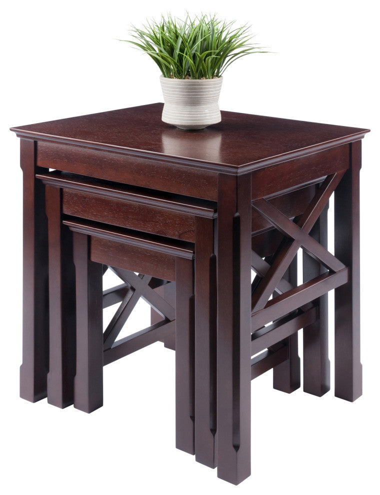 These Winsome Wood Xola Nesting Tables combine contemporary design with a functional innovative look that will be a great addition to your home. Stack the three nesting tables to keep them together as a set or use individually in the same room or separate them to use in different areas of your home. Its sleek surface is the perfect canvas for displaying an array of framed family photos in the living room or use as an accent or end table in the den to complement a traditional arrangement. Finished in a rich cappuccino, the X-cross design on the end panels gives these a charming look all while the three tables nest within each other saving space when not in use. No matter what room you choose this set blends effortlessly into any casual aesthetic. Made up of remarkably sturdy solid wood for long lasting durability, in a cappuccino finish that brings out the warmth of the wood grain. Complete the set with other furnishings from the Winsome Xola collection for a more unified space. Conveniently packed and shipped in 1 box, that includes the hardware necessary for assembling. Replacement part request can be submitted directly to the manufacturer within 60 days from date of purchase.Large table size: 21"W x 17.25"D x 22"HMiddle table size: 16.5"W x 16"D x 18.5"H Small table size: 12.2"W x 14.4"D x 15"H