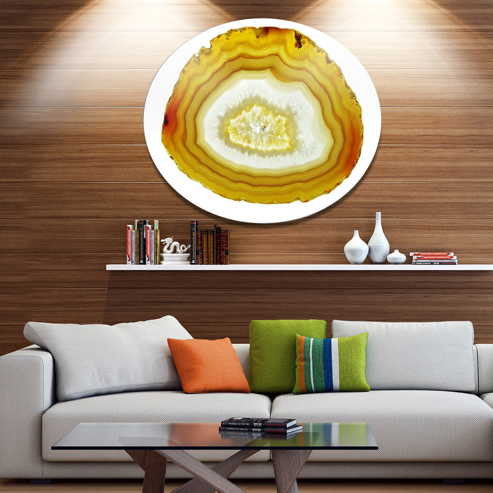Bring Contemporary Abstraction to your home with this large Circle Metal wall art. This Yellow Agate with Geological Crystal Metal Artwork makes it the focal point of any room or office.