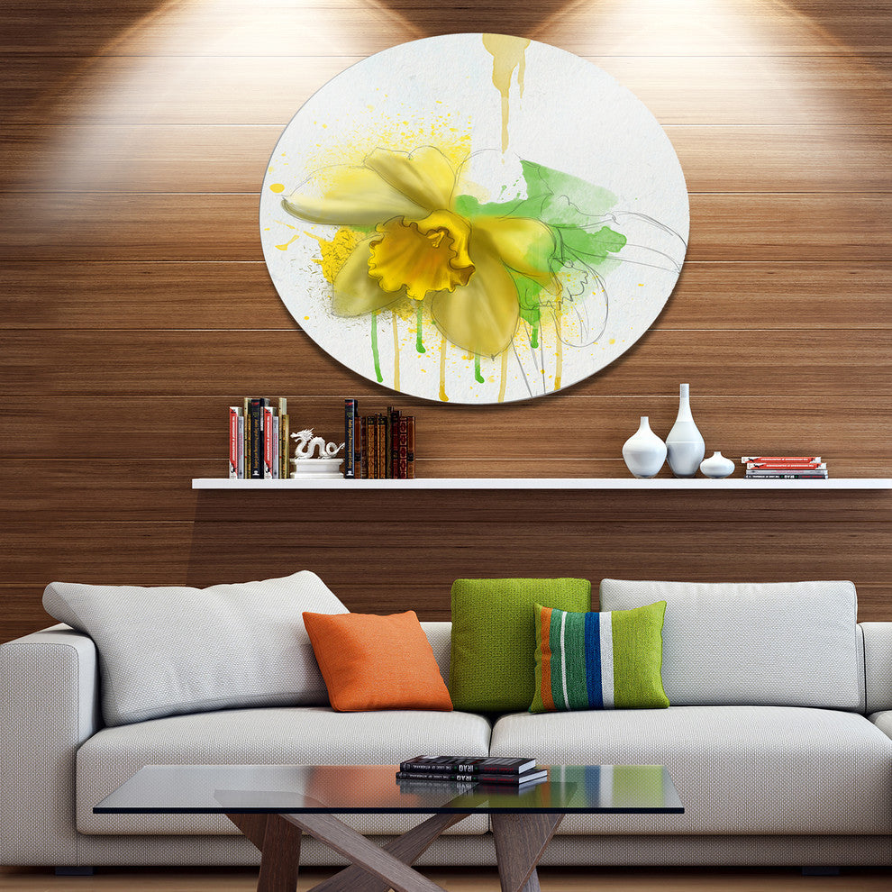 Bring Contemporary Abstraction to your home with this large Circle Metal wall art. This Yellow Narcissus Flower Watercolor Metal Artwork makes it the focal point of any room or office.