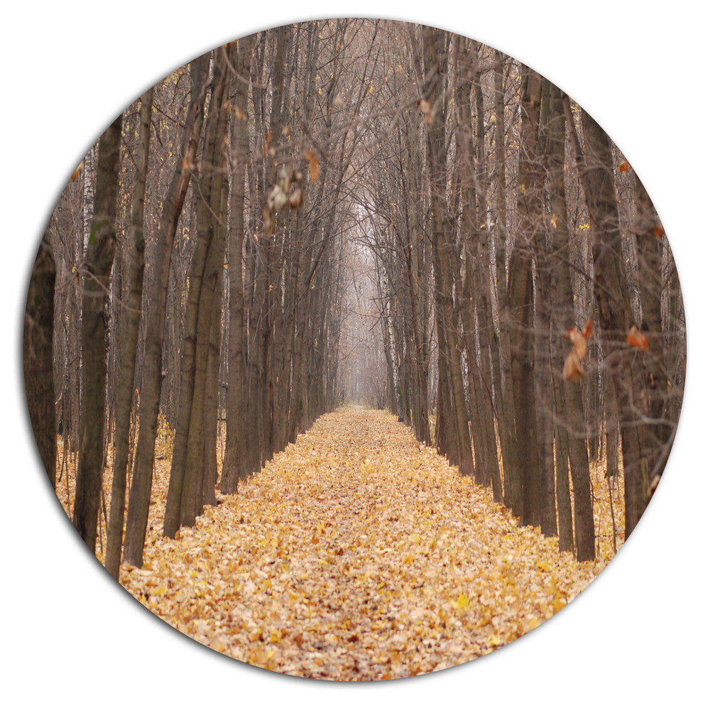 Bring Contemporary Abstraction to your home with this large Circle Metal wall art. This Yellow Road through Fall Forest Metal Artwork makes it the focal point of any room or office.