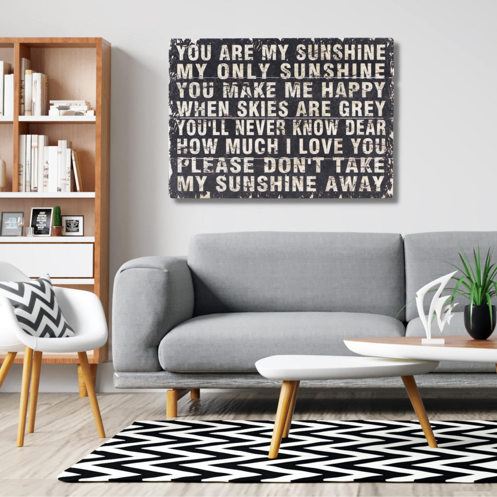 Add a touch of eclectic charm to your home with the "You Are My Sunshine" Wall Art. A heartwarming, eye-catching piece, "You Are My Sunshine" adds texture and color to a blank wall or muted space. Perfect for your bedroom or bathroom, this intriguing piece features classic song lyrics and includes attached hooks for quick and easy hanging. With neutral tones of black and white, "You Are My Sunshine" pairs well with a variety of home decor styles and color palettes.