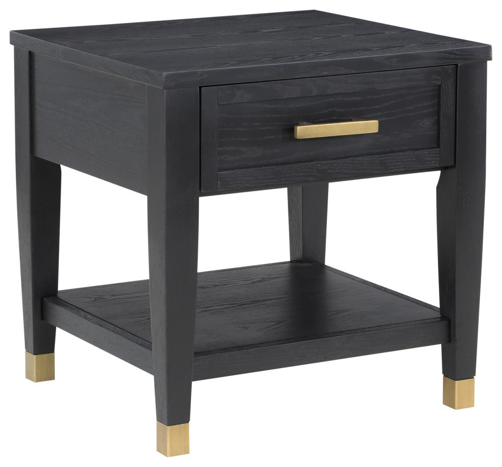 Sleek, modern style in a Side Table for a living room or bedroom. Brushed brass accents complement the beautiful black finish in a modern design that works beside a chair or bed. Storage and display options abound in this clean-lined sophisticated table that can fit in any room.