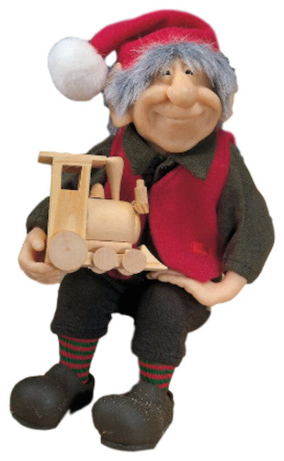Joseph is sitting on a bench and holding an unfinished toy train engine. He comes with a bench and wooden train. Zim''s Elves make it easy to believe!