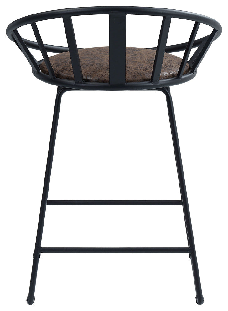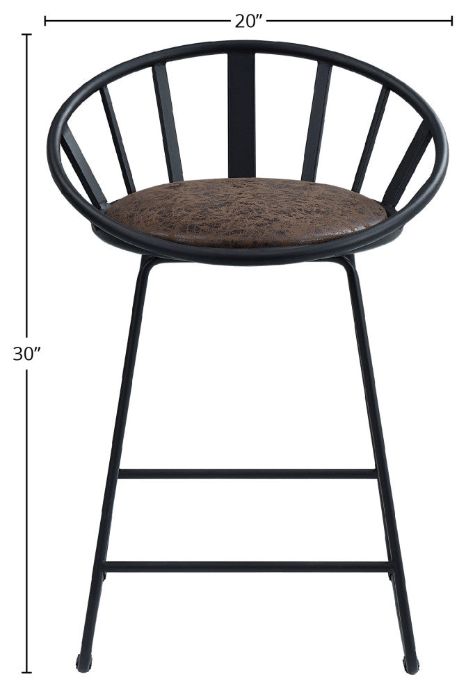 Introducing the stylish and comfortable Zudora counter height chairs that combine modern design with vintage-inspired details. The rounded seat of the chair provides a comfortable and ergonomic seating experience. It is upholstered with synthetic leather, which mimics the look and feel of aged leather, adding a touch of nostalgia and rustic charm. The slatted backrest enhances the chair''s visual appeal and provides ample support for your back. The slats not only add a decorative element but also promote airflow, ensuring a comfortable seating experience even during longer periods.Features:• Finish: Synthetic Leather & Black Finish• Material: Composite Wood, Metal, Upholstered• Foam Density: D20Dimensions:• Product Dimensions: 19"L X 19"W X 30"H• Net Weight: 28 lbs• Package Dimensions: 21.06"L X 18.9"W X 27.56"H• Gross Weight: 32 lbs• Package Type: CARTON• Ship Type: GROUND