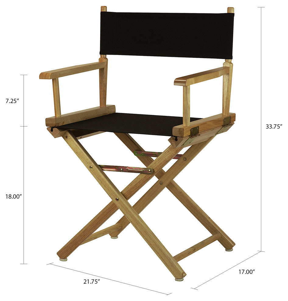 18" Director''s Chair Natural Frame-Black CanvasDiscover a variety of uses for this classic-style Director''s Chair. Constructed with 100% solid wood, this portable Directors Chair is built for lasting strength. Foldable design makes transportation and storage a breeze--meaning you can move it from room to room or transport it for special occasions with ease. An excellent solution for homes, schools, events, and businesses alike.Classic style fits permanent or temporary seating for any occasion. Foldable design for effortless transport and storage. Built-in armrests provide comfort and support. No assembly required, simply install the canvas and enjoy.Made with 100% Solid Wood for increased durability and longevity. Dimensions: 20" x 16" x 32"H, Seat-height approx. 18", Back cover size: 20" x 6", Seat cover size: 18" x 16". Item Dimensions - 21.75"W x 17"D x 33.75"HItem Weight - 7.75