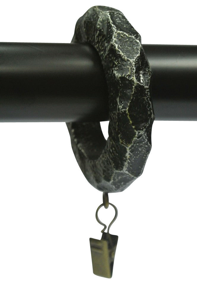 Curtain rings are a necessity, but that doesn''t mean that they have to be boring. These designer curtain rings have clips to attach to drapery panels and are made of polyresin. The ring has an inner diameter of 1 3/4"and an outer diameter of 3". The maximum recommended curtain rod size for this ring is 1 1/2". Available in 3 finishes: burnt gold, renaissance gold, and antique silver. The hammered texture is found on the entire ring.