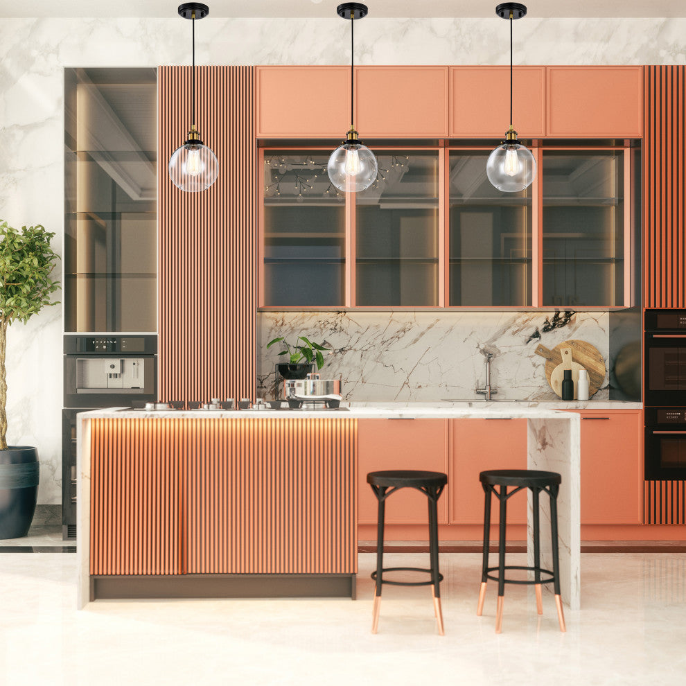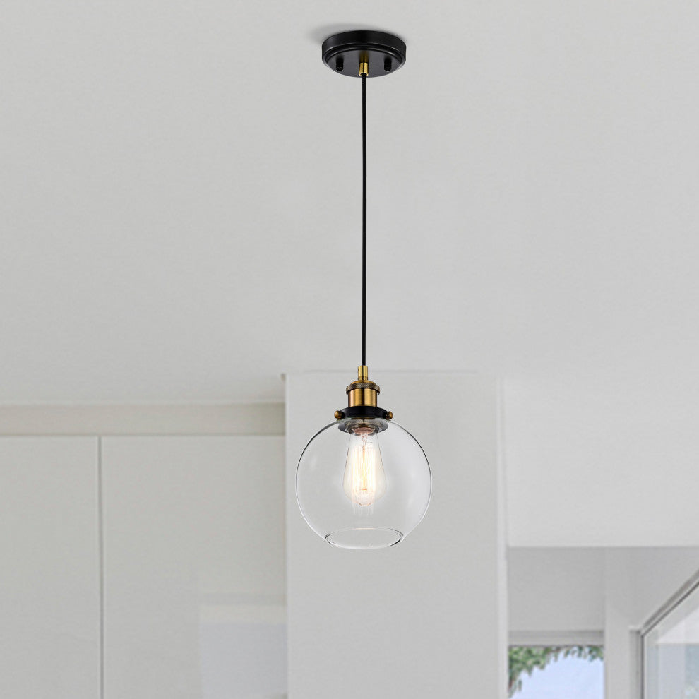 The Mateo 1 light pendant features a black and antique brass finish complete with a clear globe glass shade that allows plenty of light to illuminate any room. At 7 in. W x 9.5 in. H, the minimalist design of this modern mini pendant will beautifully adorn any room. This mini pendant is perfect for pairing above the kitchen island, office, breakfast bar, bedroom or dining room.