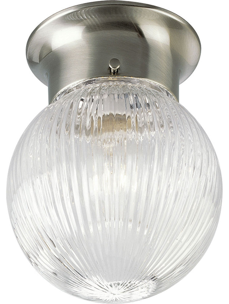 One-light close to ceiling fixture with clear ribbed glass globe. KO for pull chain switch. Three installed fitter screws retain the glass globe.Finish: Brushed NickelBulb Type: Uses Medium BaseBulb Wattage: 60Bulb Quantity: 1Listed: Damp location listedMount Type: CeilingStyle: Traditional/ClassicFeatures: One-light close to ceiling fixture with clear ribbed glass globeKO for pull chain switch.Three installed fitter screws retain the glass globe.Room Type: Bathroom Lighting and/or Outdoor LightingDimensions: Width/Diameter:6-3/8"Height:7-1/4"Specifications:Mounting:Ceiling mountedMounting strap for outlet box includedCanopy covers a standard 4 hexagonal recessed outlet box4-13/16 dia.Electrical:Pre-wired6 of wire supplied120VLamping:Quantity: 160W Medium BaseMedium porcelain socketAdditional Information:UL-CUL Damp location listed1 year warrantyCompanion fixtures are available