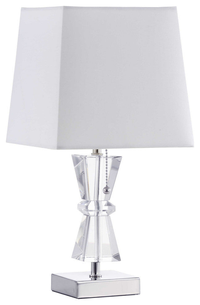 1 Light Incandescent Crystal Table Lamp Polished Chrome Finish Rolled Edge Top and Bottom Virgin White Shade Bulb Type:E26 Number of Bulbs:1 Bulbs Included:Bulbs Not Included UL Listed:UL Listed Bult Wattage:60 Hardwire or Plug:,Plug