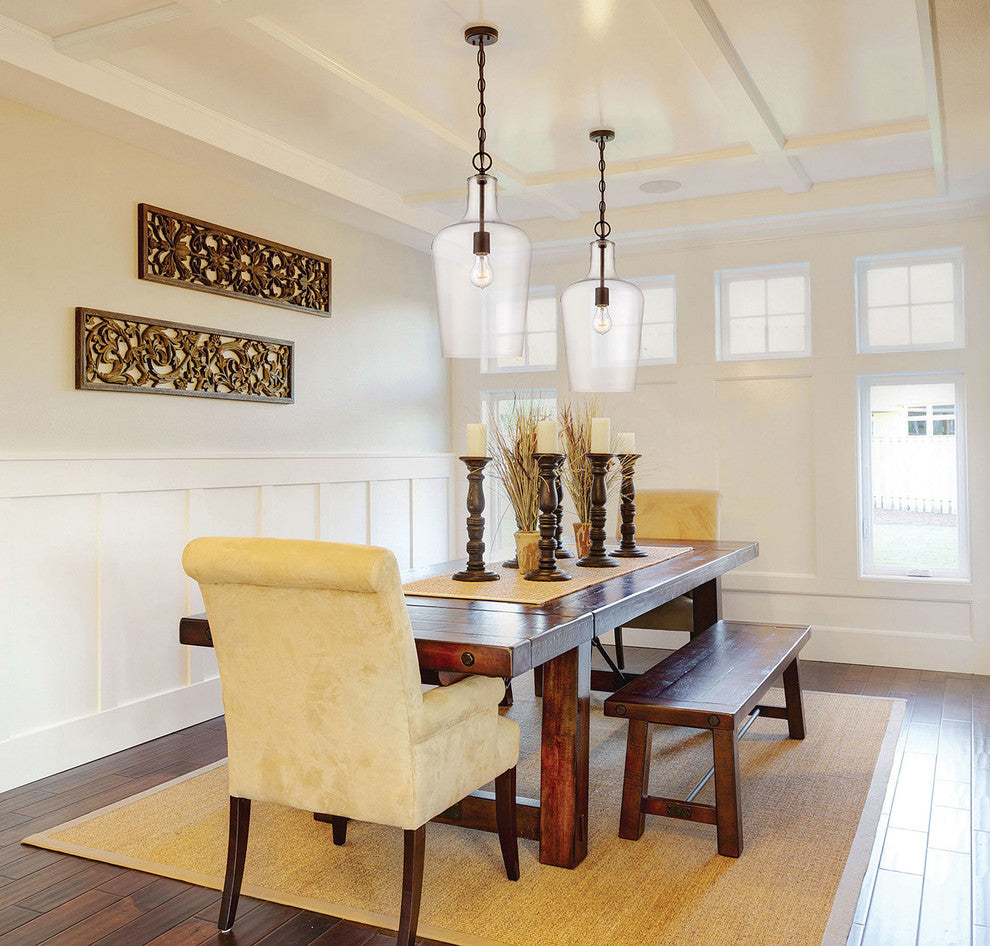 This 1-light pendant is designed to perfectly adorn any space. A large curved clear glass shade pairs well with an English bronze finish. Pendants are extremely versatile and can fit in many different spaces, such as kitchens, family rooms, great rooms, foyers, entryways, offices, bedrooms and bathrooms. Because this pendant is chain-hung, you can use as much or as little chain as you need to fit your specific hanging height needs, and this pendant can be used on a sloped ceiling. Since the bulb is exposed, try using a stylized bulb (not included) like Edison style for a different twist! The English bronze finish can be paired with bronze hardware or mixed with hardware in other finishes. It�s understated style is perfectly suited for rooms of any style.