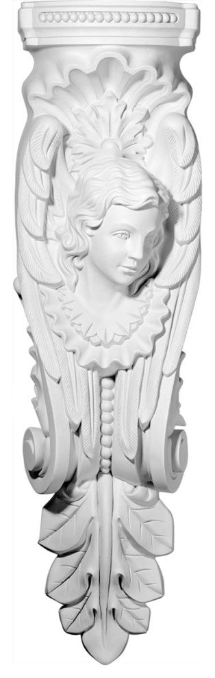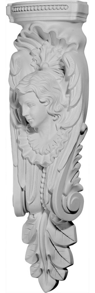 11 1/4"W x 5 5/8"D x 40 1/2"H Angel Corbel, Left. These corbels are truly unique in design and function. Primarily used in decorative applications urethane corbels can make a dramatic difference in kitchens, bathrooms, entryways, fireplace surrounds, and more. This material is also perfect for exterior applications. It will not rot or crack, and is impervious to insect manifestations. It comes to you factory primed and ready for your paint, faux finish, gel stain, marbleizing and more. With these corbels, you are only limited by your imagination.