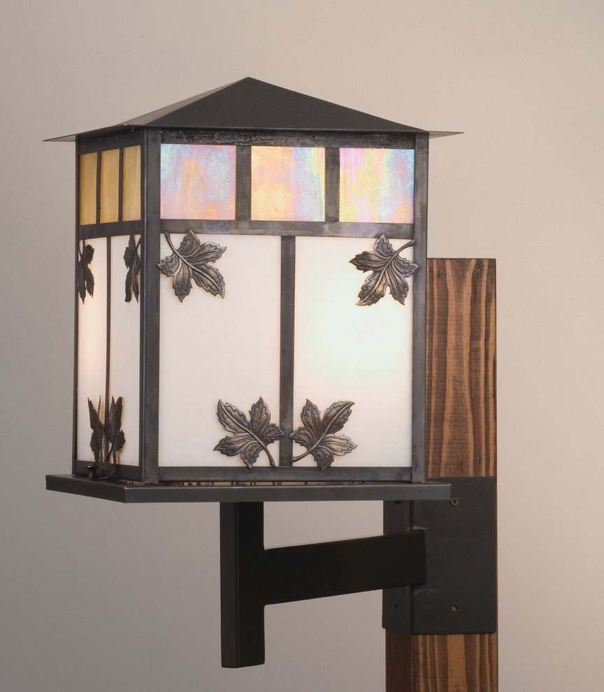 This handsome mission style pier mount fixture hast bars and maple leaves. The lantern style fixtureis handcrafted in the u s a by meyda craftsman andis hand finished in craftsman brown with beige andhoney art glass. Bulb type: med bulb quantity: 2 bulb wattage: 100
