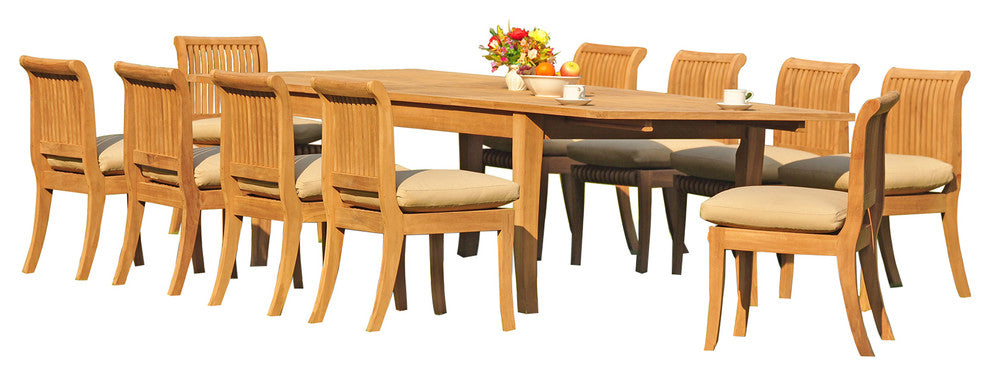 Choose your Sunbrella fabric color from the swatch shown in 2nd picture.Set includes: Sunbrella Fabric Dining Cushions for 10 Chairs & 122" Double Extension Rectangle Dining Table and 10 Armless Chairs.With a unique dual butterfly extension leaf system integrated into the table, one or both of the butterfly leaves can be collapsed or extended at any time.There is a 2" hole for umbrella in middle of table, lid (wooden cap) provided to cover hole when umbrella not in use.Stainless steel is also used to complement the beauty of teak in the construction of our furniture.All critical connections are made in the traditional mortise-and-tenon joinery with the strictest tolerances. We use only select kiln-dried teakwood.Cushions Thickness is 2.5". All the Cushions comes with a zipper in the back side and ties for easy removal when needed.Assembly: Very little assembly is required (Hardware & Instructions included). Assembly is quick and simple.Please search Houzz for our tailor made, high quality cushions for this furniture set by looking for "Sunbrella Fabric Outdoor Cushion" in the Houzz search tool!Table Dimension: 83" Length (Closed position), 102.5" (Single leaf extended out) and 122" Length (Both leaves extended out), 43" Width, 31" Height, 2" Umbrella Hole is in the center of the tableArmless Chair Dimension: 19.5" Width x 22" Depth x 34.5" Height; Seat Dimensions: 19.5" Width x 18" Depth