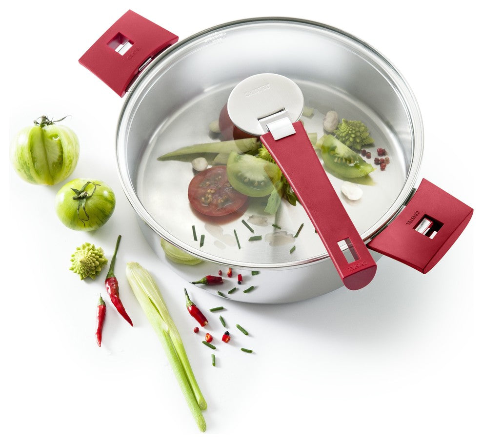 The 12" Domed Glass lid is made from impact resistent glass. It features a center knob that can also accept a Detachable Long Handle so you never need an oven mit or glove to check on foods in a hot oven. It fits the the 7 Qt. Saute pan, as a replacement lid. It is dishwasher safe, is made in France and comes with a limited lifetime warranty.