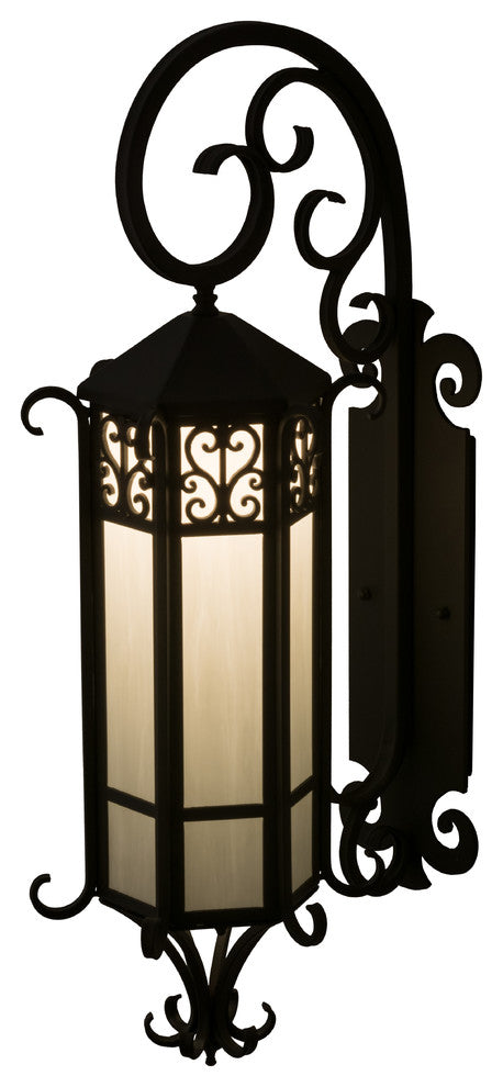 Grand stature and an ornate hand-forged metalwork create a rich, luxurious look for Caprice. This high-styled wall fixture features White art glass, which is enhanced with a scrolled accents featured in a Wrought Iron finish. This sconce is ideal to complement a variety of architectural styles for today''s exteriors and interiors. Custom crafted in the USA, this fixtures offered in custom sizes, finishes and styles, as well as energy efficient lamping options.