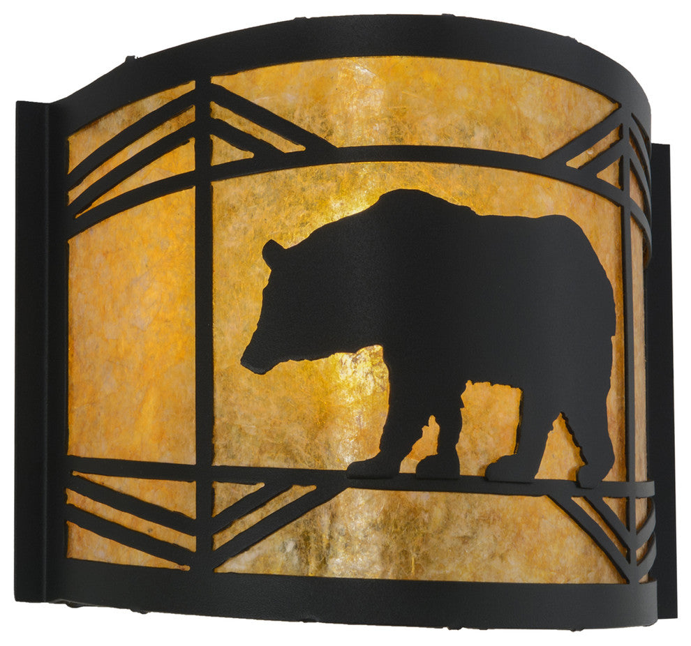 A black bear in a diamond pattern is featured on thisnature inspired wall sconce. Illuminated through ambermica panels, the fixture has a black finish and ishandcrafted in the usa by meyda artisans. Bulb type: med bulb quantity: 1 bulb wattage: 60