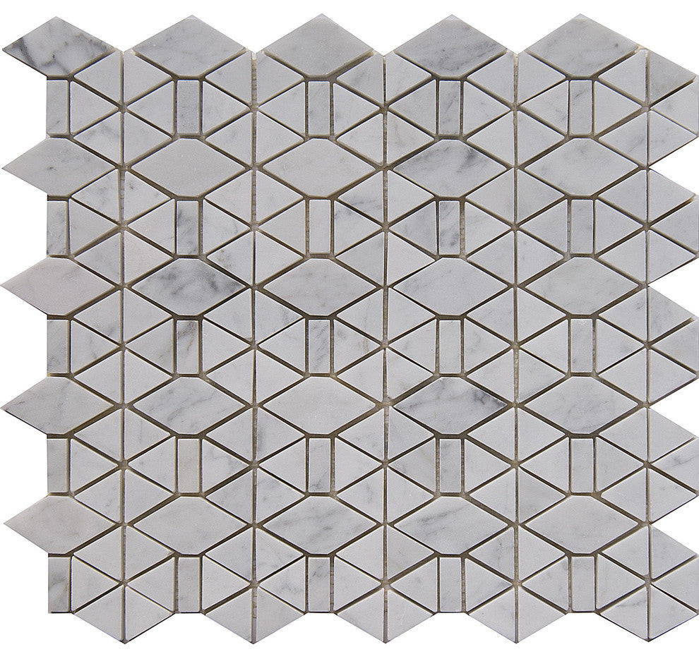 Specifications:General Name: Marble Mosaic TileCollection: Carrara White MarbleName: CWMSKU: CWMM1TRIType: Mosaic TileSize: 12"x10-3/4"x3/8"Chip Size: TriangleFinish: PolishedApplication: Wall and Floor