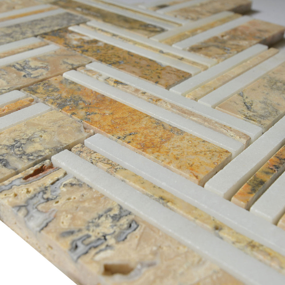 Specifications:General Name: Marble Mosaic TileCollection: QuiltName: MooreSKU: MM 8104Type: Mosaic Tile Size: 12"x11"Chip Size: Mixed Big Herringbone, 1"x4", 1/4"x4"Finish: PolishedApplication: Wall and Floor