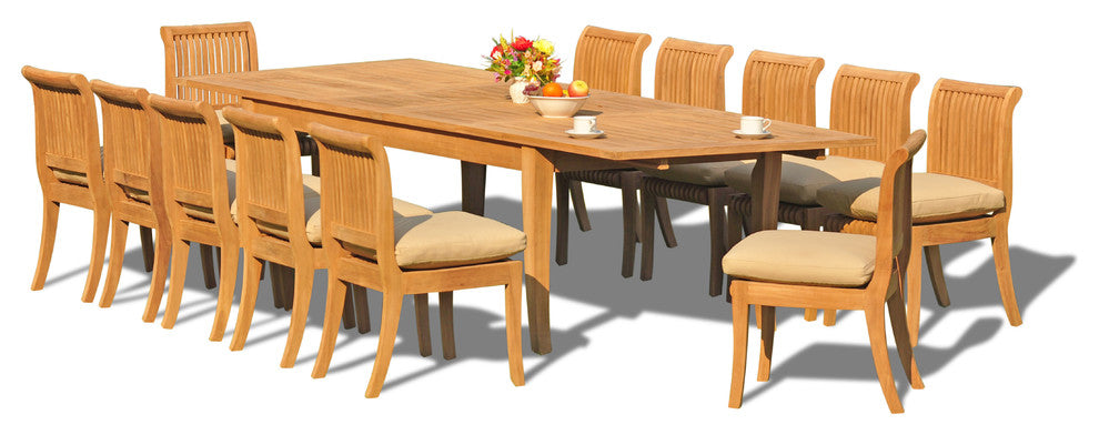 Choose your Sunbrella fabric color from the swatch shown in 2nd picture.Set includes: Sunbrella Fabric Dining Cushions for 12 Chairs & 122" Double Extension Rectangle Dining Table and 12 Armless Chairs.With a unique dual butterfly extension leaf system integrated into the table, one or both of the butterfly leaves can be collapsed or extended at any time.There is a 2" hole for umbrella in middle of table, lid (wooden cap) provided to cover hole when umbrella not in use.Stainless steel is also used to complement the beauty of teak in the construction of our furniture.All critical connections are made in the traditional mortise-and-tenon joinery with the strictest tolerances. We use only select kiln-dried teakwood.Cushions Thickness is 2.5". All the Cushions comes with a zipper in the back side and ties for easy removal when needed.Assembly: Very little assembly is required (Hardware & Instructions included). Assembly is quick and simple.Please search Houzz for our tailor made, high quality cushions for this furniture set by looking for "Sunbrella Fabric Outdoor Cushion" in the Houzz search tool!Table Dimension: 83" Length (Closed position), 102.5" (Single leaf extended out) and 122" Length (Both leaves extended out), 43" Width, 31" Height, 2" Umbrella Hole is in the center of the tableArmless Chair Dimension: 19.5" Width x 22" Depth x 34.5" Height; Seat Dimensions: 19.5" Width x 18" Depth