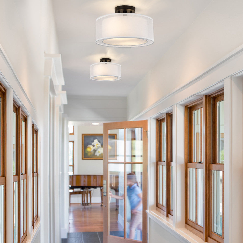 The 2 light drum shaded semi flush mount ceiling light fixture has a unique blend of transitional with contemporary elements. The white fabric drum shade and matte black canopy make this fixture great for rooms with variety of decor. Dual drum fabric shade helps create more ambient light, perfect for any urban decor or to help you create the look of city living, which is an ideal selection for bedroom, hallway, entryway, stairway, door way, closet, kitchen, sitting room or a foyer as a ambient light.ETL listed for dry locations, for indoor use.Fixture dimensions: 13 in. W x 9.3 in. overall height. 5.1" black canopy.E26 medium base socket, (2) 60-Watt MAX incandescent bulbs or equivalent LED bulbs(bulbs not included)Dimmable with a compatible dimmer switch and dimmable light bulb to create the perfect atmosphere (dimmer switch and bulb not included)Includes all mounting hardware for quick and easy installationGreat for transitional, contemporary style decorBefore cleaning any lamp shade or fixture, disconnect the power source, wipe with a soft, dry cloth, avoid the use of chemicals and household cleaners as they may damage the finish.Warranty: 1-year limited warranty. Damage in tranist/Defects need to be reported with photos within the window for replacements. If any product support needed, write to us and we will response in 24hrs.