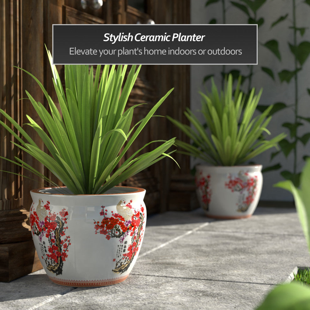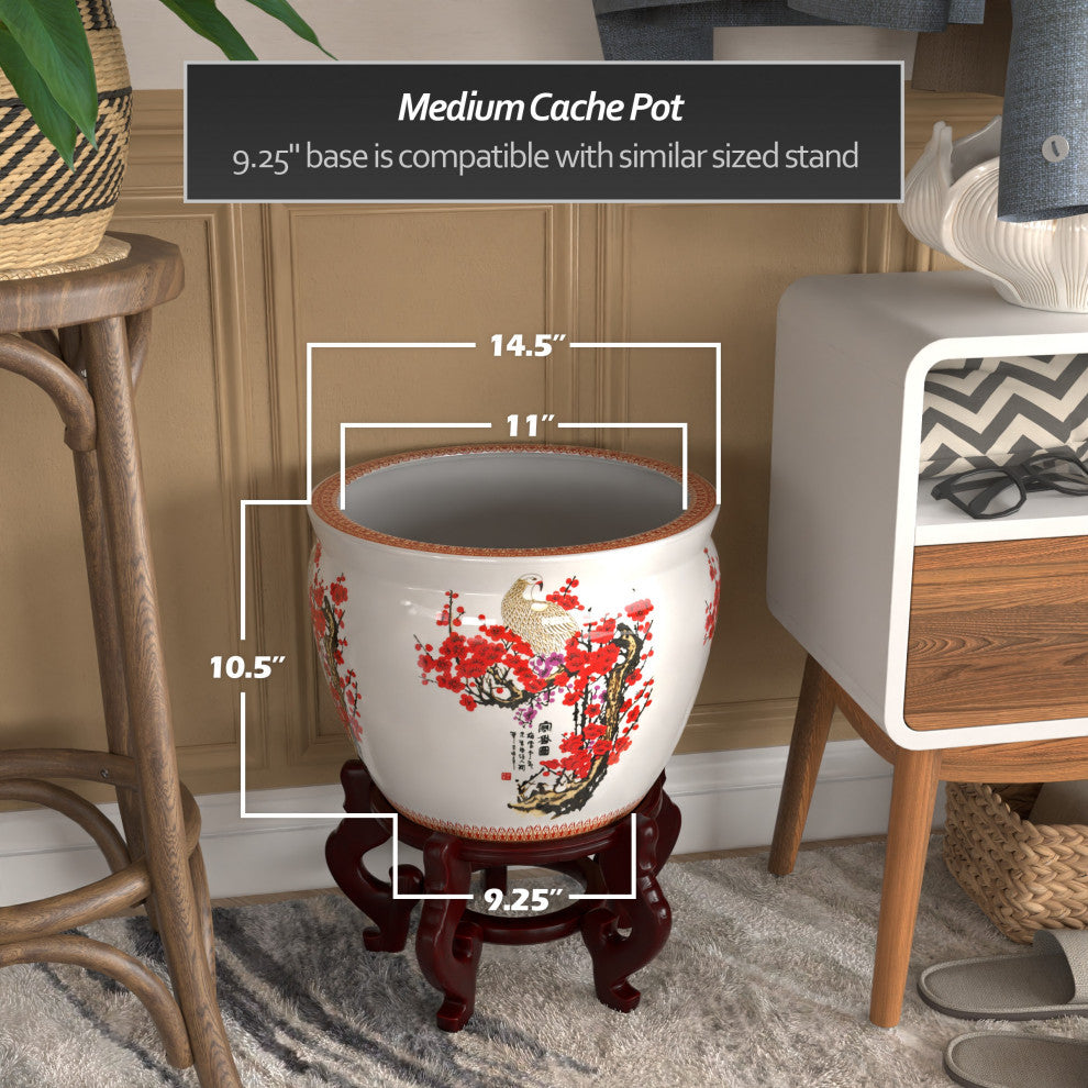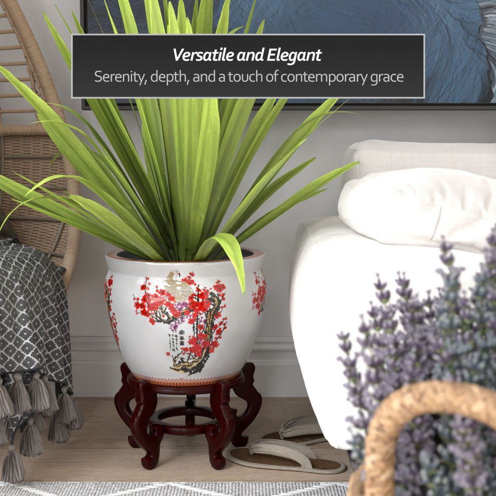 Add an attractive Asian accent to your foyer, living room, dining room, or study with this authentic imported oriental porcelain fishbowl. An elegant decorative planter pot, perfect for a silk or live indoor tree, live or cut flowers, or long lived favorite house plant. Note that there is no drainage hole, so live plants should be removed for watering.Handmade Cherry Blossom Finish: A celebration of traditional Chinese artistry depicting red cherry blossoms on pristine white porcelain. A timeless symbol of beauty, the renewal of spring, and the harmony of nature.Chic Medium Cache Pot: Elevate your plant''s home indoors or outdoors with this stylish design. 11" wide opening ideal for inserting a planter since there is no drainage hole. Its 9" base is compatible with similar sized stand.Traditional Craftsmanship: This was made by hand in a small workshop by a traditional artisan employing centuries of knowledge and cultural heritage. Each piece is a unique work of art and may vary slightly in exact design and detail.Modern High-Temperature Firing: This exceptional ceramic boasts a vitreous porcelain finish achieved through firing in a state-of-the-art high-temperature kiln. Its strength and durability ensure a top-quality, reliable product for all your needs.Classic Design for Today''s World: By supporting traditional artisans in a changing world you help keep their crafts alive and available. These vanishing arts are precious and make a beautiful gift for a birthday, anniversary, housewarming, or holiday.Opening Diameter: 11"Bottom Diameter: 9"