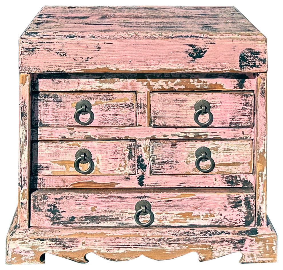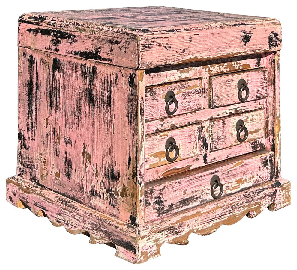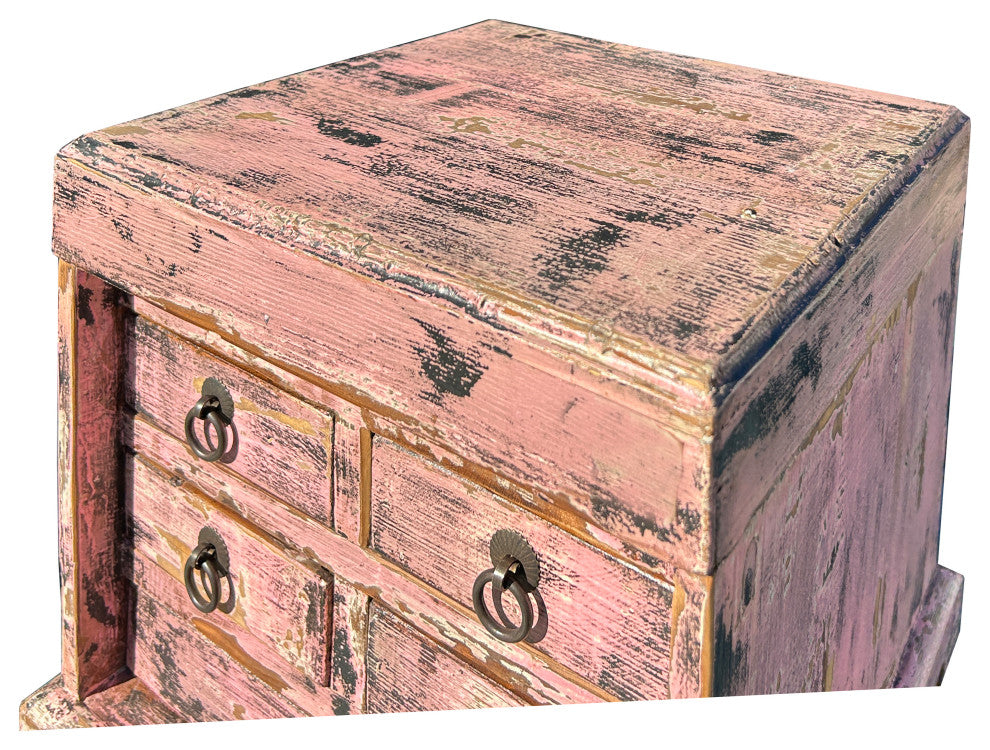 This image features a small, vintage wooden cabinet with a distinctly distressed appearance, exuding rustic charm. The cabinet is painted in a faded pink hue, though the paint has peeled and chipped in many areas, revealing the natural wood grain underneath and giving it a weathered, timeworn look. The piece has a boxy shape with a flat top, which is equally distressed, showing scratches and discoloration. The front of the cabinet features four drawers, each adorned with a simple, round metal pull that adds to its antique aesthetic. The drawers themselves are slightly misaligned, further emphasizing the cabinet''s aged character. The base of the cabinet has a subtle scalloped edge, providing a touch of decorative flair to an otherwise utilitarian design. The cabinet''s soft pink tones and rugged texture stand out, making it an ideal piece for a shabby chic or vintage-inspired interior.Dimensions: w14" x d12" x h13" , inside drawer 4.75" x d7.5" x h1.5" / 10.5" x d8" x h1.25"Origin: ChinaMaterial: Elm WoodCondition: hand made, minor color off, vintage style finish, variation on distressed marks Work: no assembly required, ship in one pieceUSA domestic continental buyers of 48 states pay $80 shipping (buyers of Hawaii, Alaska, US Islands, Florida Keywest, and Canada pays the extra shipping cost). Insurance and handling charges are already included in the shipping cost. In store pick up is highly welcomed if you are in San Francisco Bay Area. (No charge)