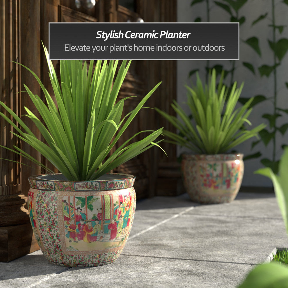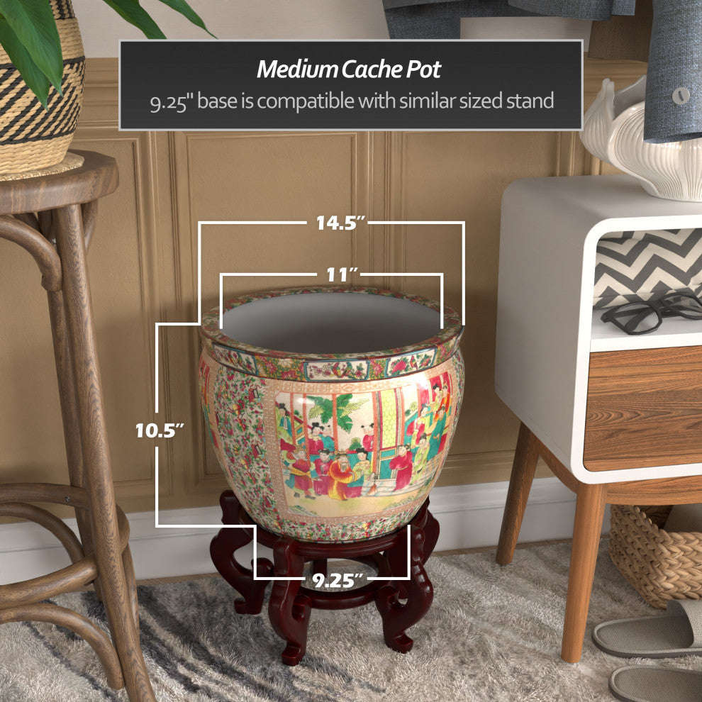 A beautiful porcelain fishbowl featuring a brightly colored applique of floral patterns and stylized images of an Asian court scene, fired onto the porcelain in a kiln. The wide lip of the bowl is painted an auspicious red. Traditionally used to house goldfish and koi; now commonly used as planters for small houseplants or as elegant decorative accents in their own right.Rose Medallion Design: Embrace the captivating beauty of this classic Chinese porcelain style. Its intricate handmade patterns of roses, peonies, birds, and butterflies exudes a graceful elegance that stands the test of time.Chic Medium Cache Pot: Elevate your plant''s home indoors or outdoors with this stylish design. 11" wide opening ideal for inserting a planter since there is no drainage hole. Its 9" base is compatible with similar sized stand.Traditional Craftsmanship: This was made by hand in a small workshop by a traditional artisan employing centuries of knowledge and cultural heritage. Each piece is a unique work of art and may vary slightly in exact design and detail.Modern High-Temperature Firing: This exceptional ceramic boasts a vitreous porcelain finish achieved through firing in a state-of-the-art high-temperature kiln. Its strength and durability ensure a top-quality, reliable product for all your needs.Classic Design for Today''s World: By supporting traditional artisans in a changing world you help keep their crafts alive and available. These vanishing arts are precious and make a beautiful gift for a birthday, anniversary, housewarming, or holiday.Bottom Diameter: 9"