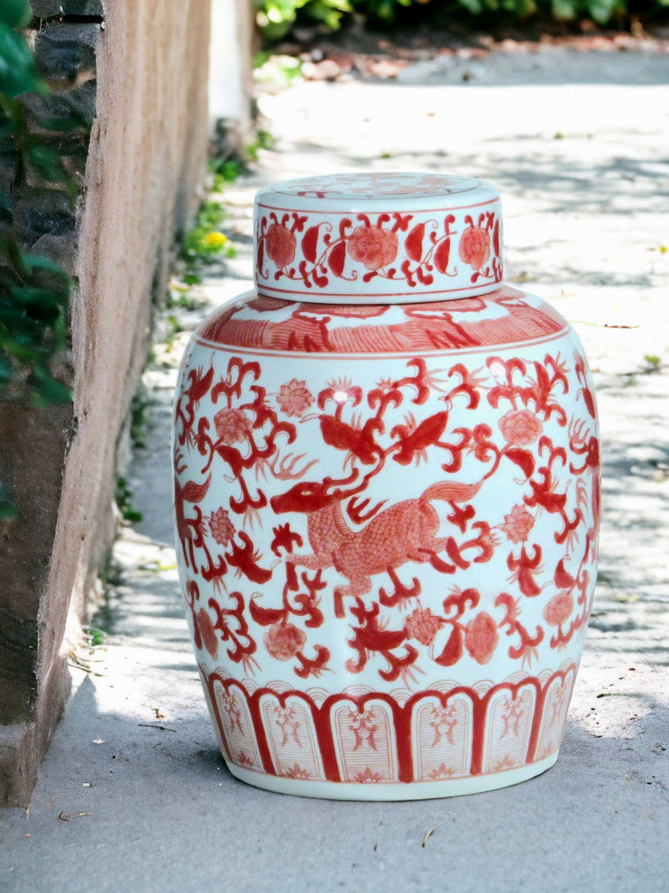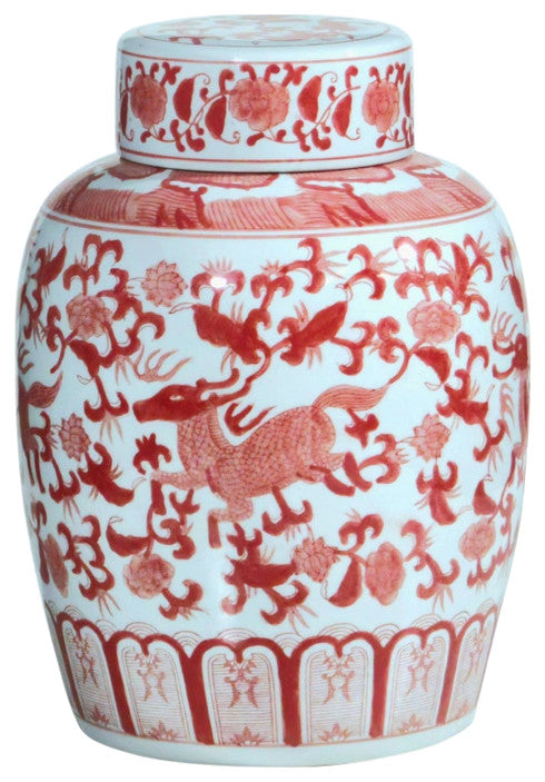 This 15" Ginger Jar with Chinoiserie Deer Design is a stylish and functional addition to any room. Made from durable porcelain, it features a detailed deer design that adds a touch of elegance anywhere it graces. The jar includes a matching porcelain lid, keeping contents secure and dust-free. Perfect for storing items or as a decorative piece, it effortlessly enhances your decor while offering practical storage. Its timeless design makes it a versatile choice for any style, from traditional to modern.Features:Overall product dimensions are 12" W x 12" D x 15" HComes with a matching lid to keep contents safe and dust-freeHigh-quality porcelain construction ensures lasting durability and useSimple to wipe clean, keeping it looking pristine effortlesslyAvailable in blue and red color variationsDimensions:Vases, Urns, Jars, and BottleAssembled Product: 12 inches wide x 12 inches deep x 15 inches highWeight Capacity: 5 poundsDiameter: 12 inches