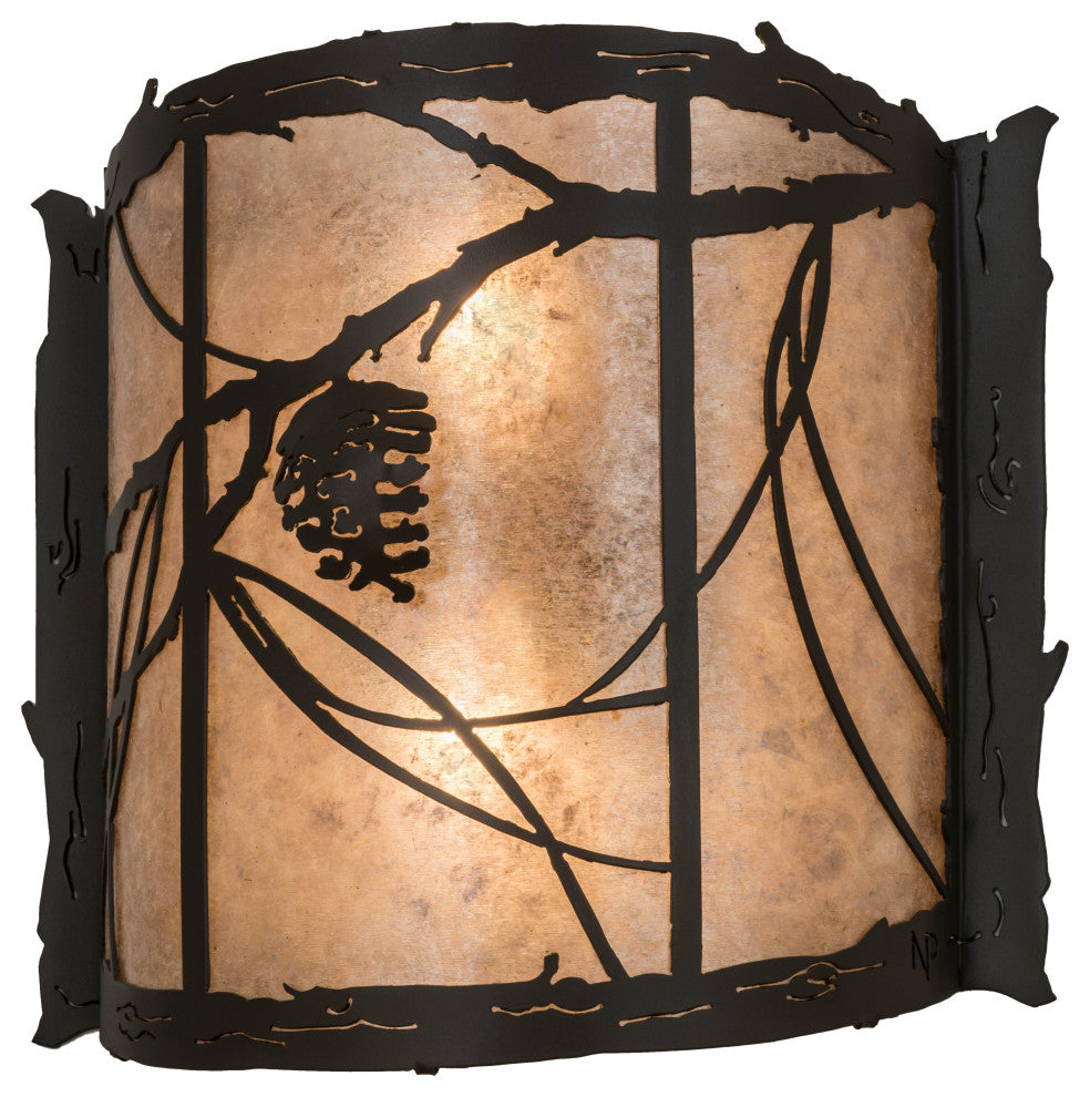 A single Pine Cone with branches and Pine needles accent this rustic wall sconce handcrafted in the USA by Meyda artisans. This nature inspired fixture is finished in Timeless Bronze and has a Silver mica panel.